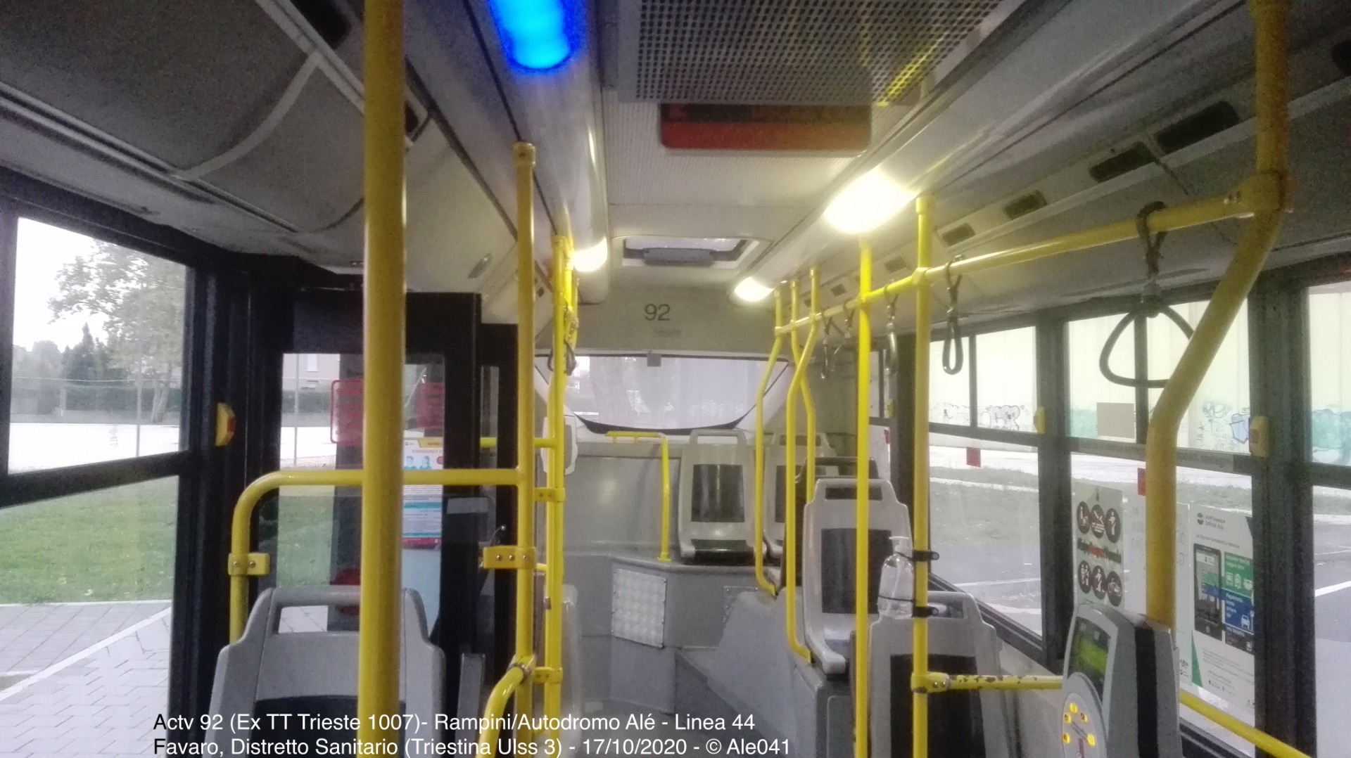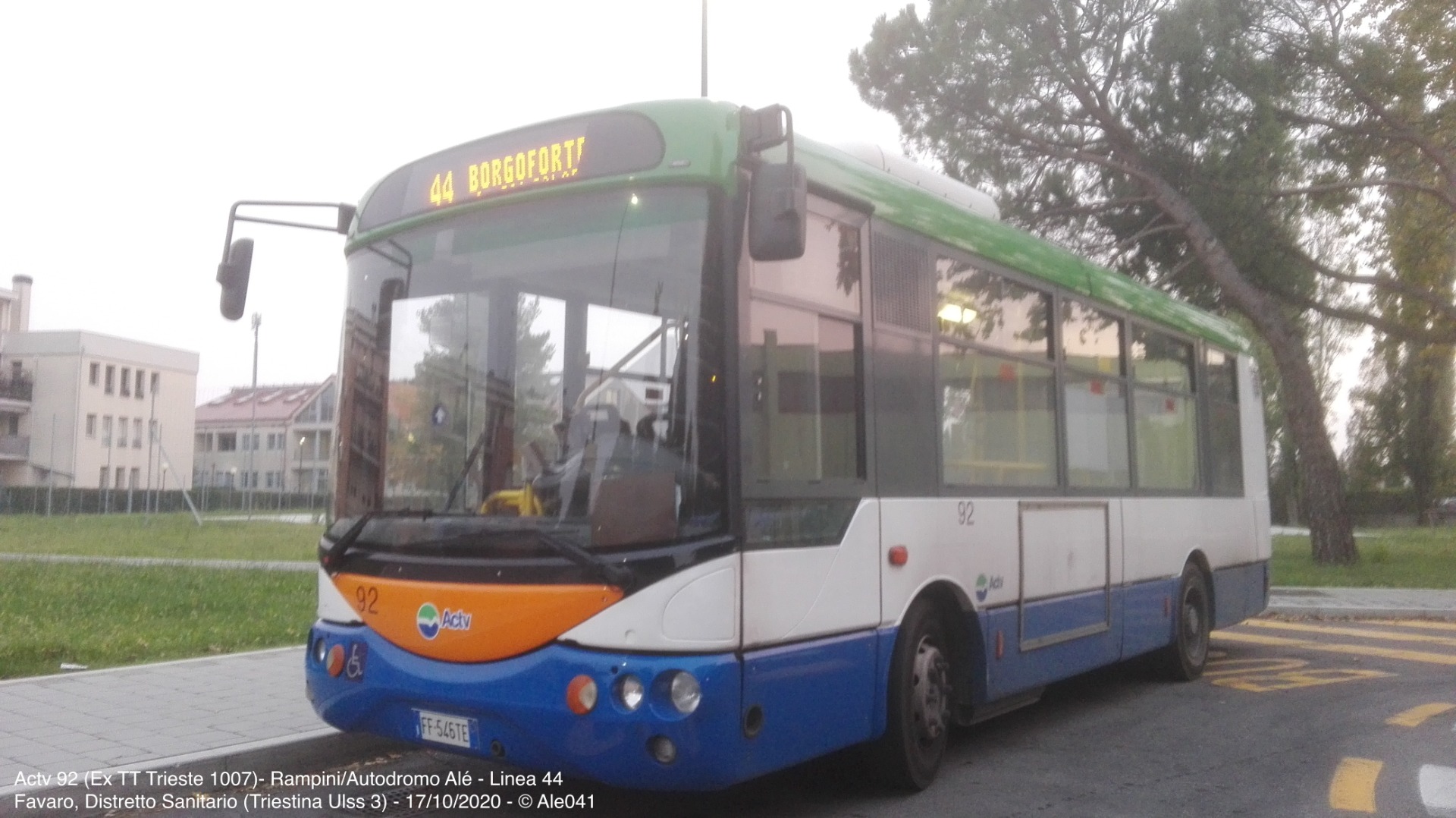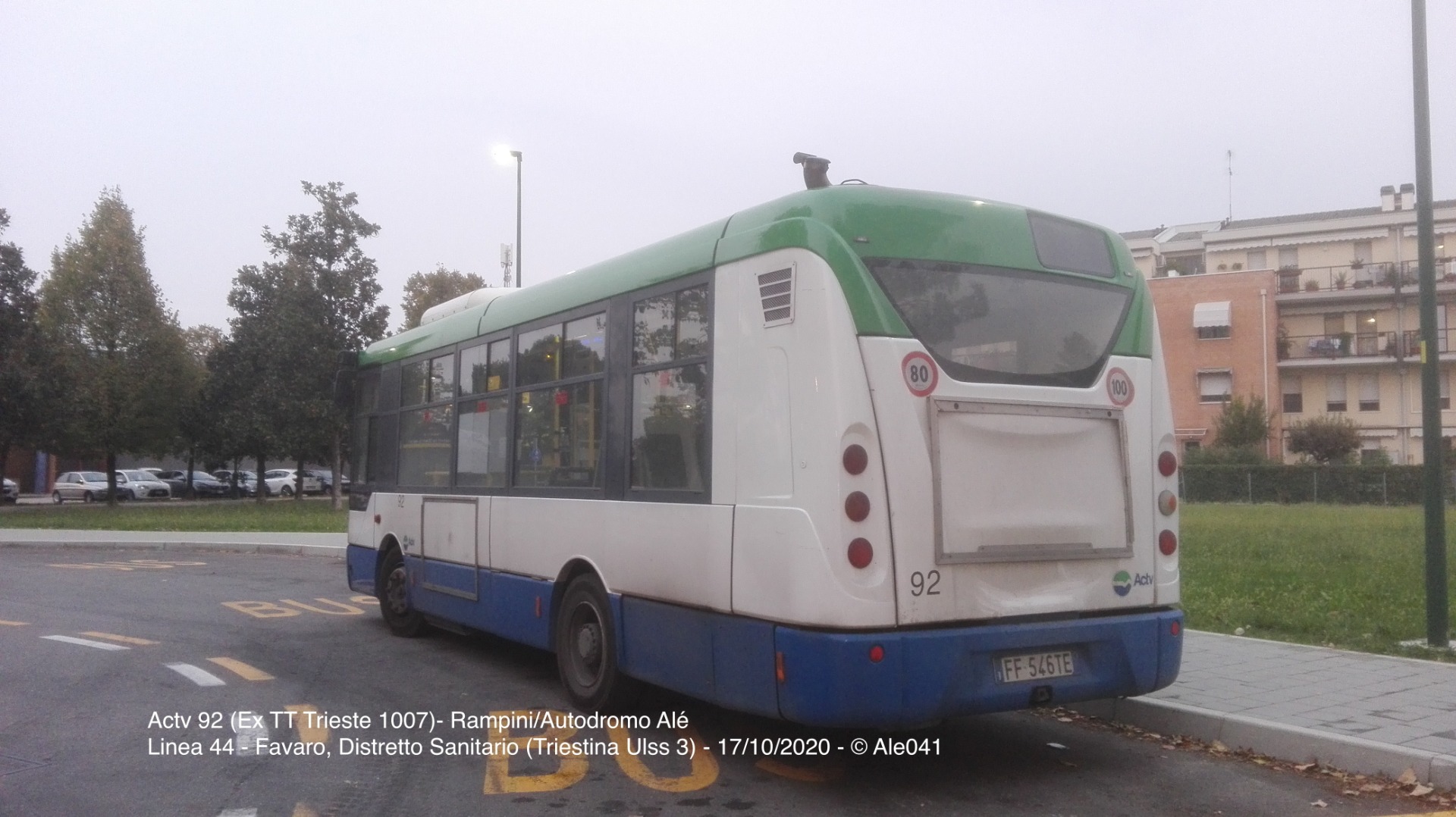 Foto scattate a Favaro, Distretto Sanitario (Fermata "Triestina Ulss 3"), sabato 17 ottobre 2020, alla matricola 92 (ex TT Trieste 1007), costruita nel 2008, e in Actv dal 2017. Corsa delle 18:25.